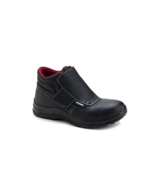 Calzatura alta in pelle fiore colore nero con cuciture in colore grigio, fodera interna di colore rosso, soletta anatomica, traforata, con tallone antishock, estraibile, traspirante ed antistatica. Protezione frontale con chiusura a strappo, sfilamento rapido, linguetta imbottita, puntale in acciaio, lamina tessile. Suola antiscivolo in poliuretano bidensità. Calzata 11 Mondo Point