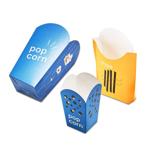 Contenitori per popcorn personalizzabili, in cartoncino per alimenti da 350 g. Senza plastica, 100% riciclabili e compostabili. Disponibili in 3 formati, anche da 1 pezzo.