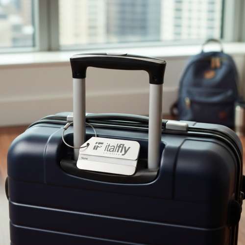 Segnavaligia inox con superficie scrivibile a penna, laccio in caucciù, cavetto in acciaio e astuccio lusso.