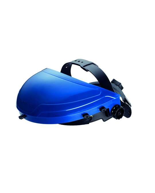 Semicalotta ergonomica in materiale anallergico, fascia frontale antisudore in spugna intercambiabile, banda superiore per la regolazione dell’altezza della calotta, regolazione circonferenza cranica tramite cremagliera (da 53 a 61 cm), ribaltabile di 90° tramite frizioni, 5 punti di aggancio per lo schermo, certificata con i simboli per il campo di utilizzo 3, 8 e 9 della EN166 per protezione da schizzi liquidi, arco elettrico e proiezioni di metallo fuso, resistente ad impatti e a temperature estreme. Priva di parti metalliche esposte per la protezione da arco elettrico.