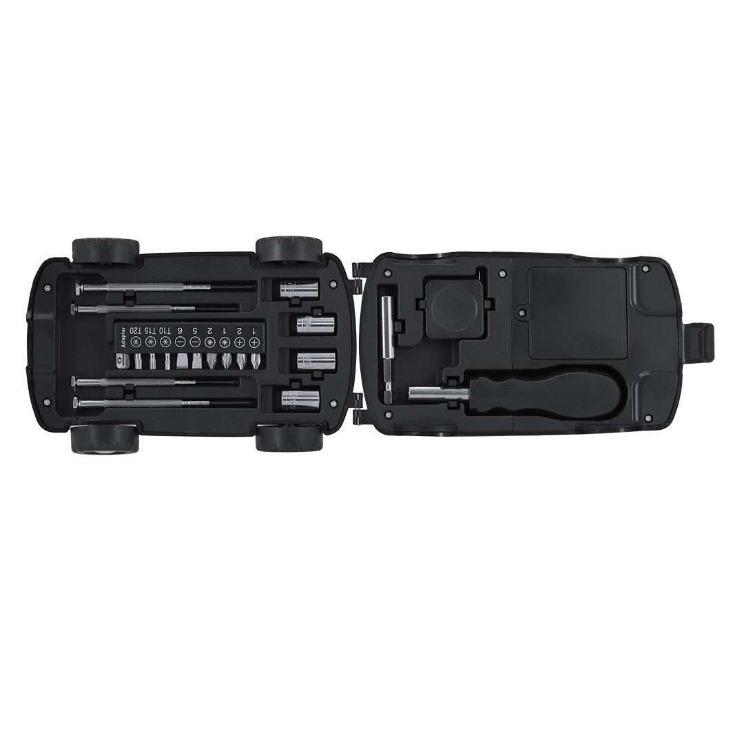 Set di attrezzi con astuccio a forma di auto e torcia LED. Con 20 attrezzi. Include:- Set di cacciaviti di precisione (piatti e a stella)- Utensile di fissaggio- Manico multifunzione con punte di cacciavite piatte e a stella- Chiavi a tubo a testa esagonale- Metro a nastroCon torcia con 2 LED integrati nell'astuccio, alimentata da 4 batterie AAA (non incluse).