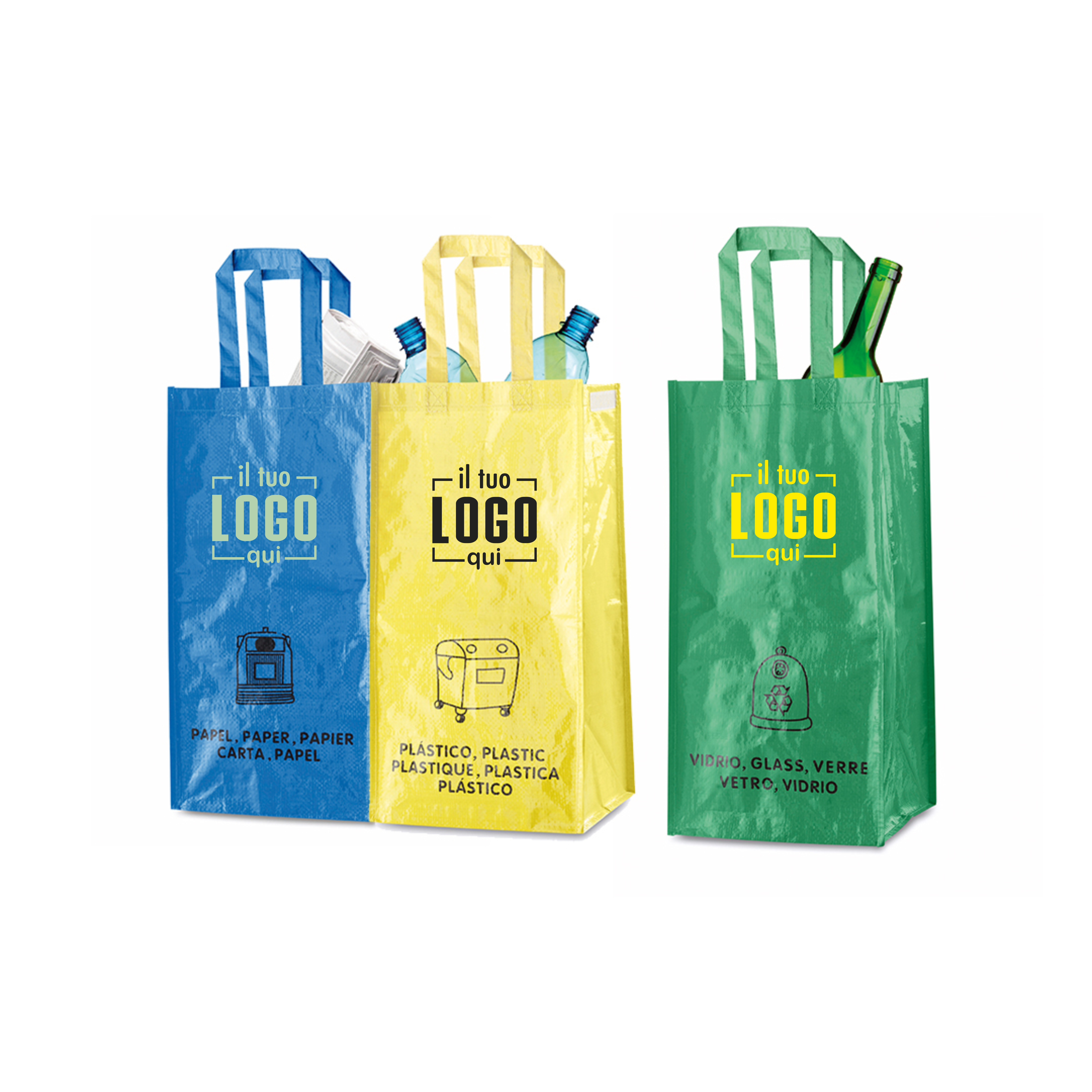 Set di 3 sacchetti per il riciclaggio giallo-verde-blu in robusto tessuto pp laminato da 125 g/m2 con finitura lucida. Include 3 sacchetti di 23x45x23 cm uniti da robuste chiusure in velcro sui lati. Con maniglie rinforzate e indicazione dei tipi di rifiuti: plastica e imballaggi, vetro e carta.