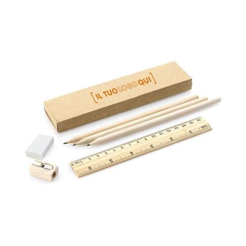 Pratico set da scrittura da 6 pezzi, ideale per scuole, uffici ed eventi promozionali. Include 3 matite in legno con corpo rotondo naturale e mina nera, un righello da 20 cm con doppia scala metrica (centimetri/pollici), una gomma e un temperamatite. Il tutto presentato in una confezione compatta in cartone riciclato, per un tocco ecologico e sostenibile.