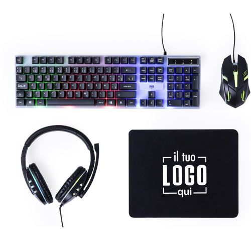Set da gioco per un'esperienza di gioco coinvolgente. Include mouse ottico e tastiera QWERTY in spagnolo, entrambi retroilluminati con luce LED multicolore e con connessione via cavo USB. In più un morbido tappetino per mouse in poliestere, con base in silicone antiscivolo, perfetto per un controllo preciso del mouse. Il set si completa con gli auricolari audio surround, retroilluminati con luce LED multicolore, con microfono integrato e connessione jack 3,5mm. Set in un'elegante finitura nera, presentato in una scatola kraft individuale.