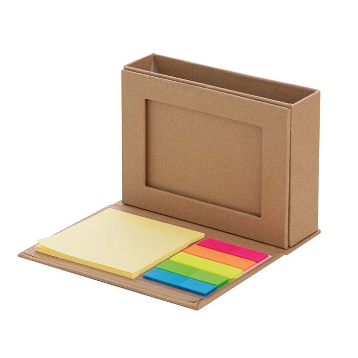 portapenne da scrivania; 1 blocco foglietti adesivi; 5 blocchi segnapagina colorati adesivi; portafoto; tecnica di stampa consigliata: serigrafica - UV