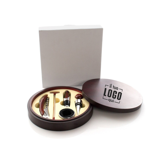 Set da vino dall'elegante design circolare e finitura in legno naturale. Accessori in acciaio inox e legno. Include cavatappi, apribottiglia con taglia capsule e apri capsule, tappo di sughero, dosatore, contagocce e termometro. Confezionato singolarmente in una custodia con interno in morbida schiuma beige fustellata.