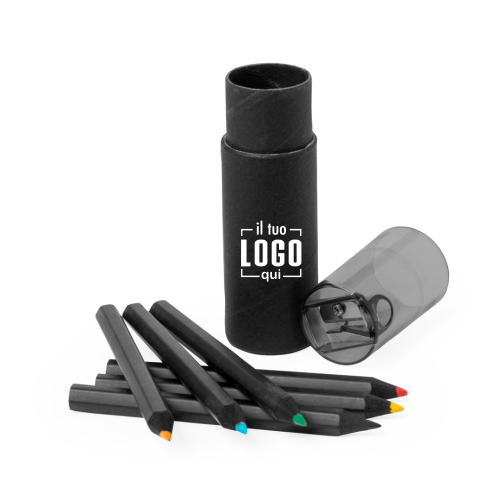 Set 6 matite colorate nere con temperamatite e scatola eco | Personalizzato