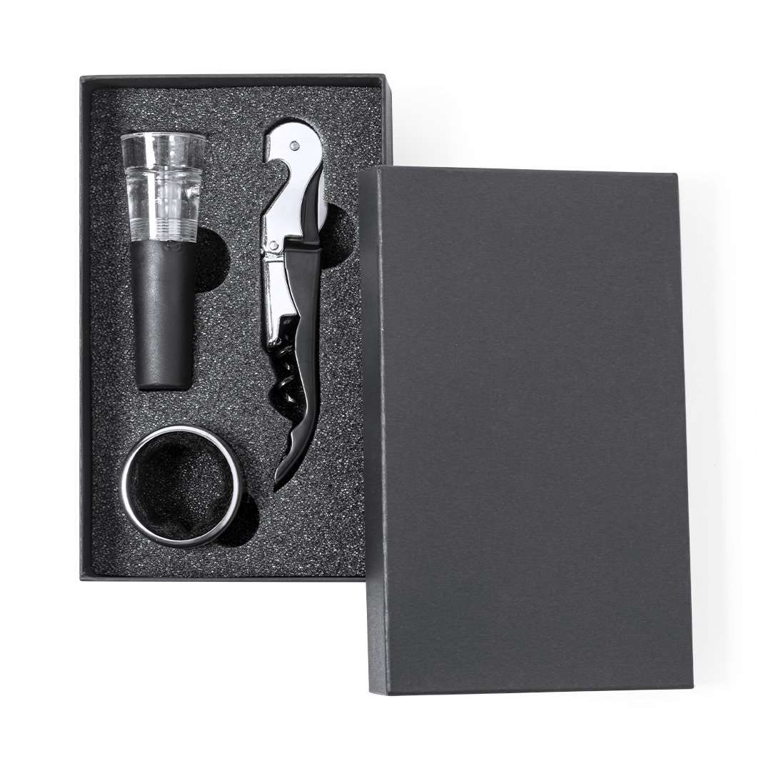 Set completo per il vino con una sobria finitura nera, presentato in un astuccio individuale con interno in schiuma fustellata e copertura protettiva bianca. Include un tappo a goccia, un cavatappi in acciaio inossidabile e un tappo per il sottovuoto.