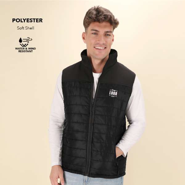 Gilet impermeabile e traspirante in una combinazione di materiali soft shell e poliestere. Elegante struttura nera con chiusura a zip e tasche laterali con zip con tiretti per una facile apertura. Disponibile nelle taglie S, M, L, XL, XXL.