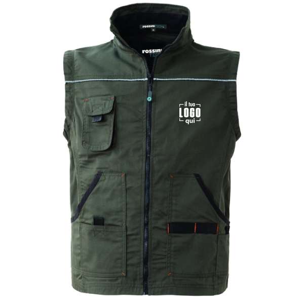 Gilet da lavoro con collo alla coreana e chiusura anteriore con cerniera. Un taschino applicato al petto destro chiuso con aletta e velcro, due tasconi inferiori con taschini applicati chiusi con punto velcro. Carré anteriore e posteriore profilati con coda di topo rifrangente, inserto in nylon.