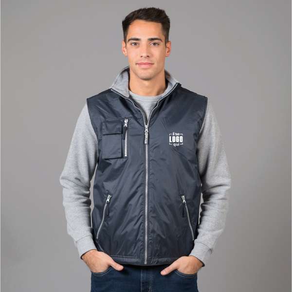 Gilet in poliestere pongee- Spalmatura in PVC impermeabile- Fodera in pile antipilling- Interno collo in pile- Una tasca con zip sul petto- Un taschino portacellulare sul petto- Due tasche esterne con zip- Una tasca interna portafoglio con velcro- Coulisse al fondo