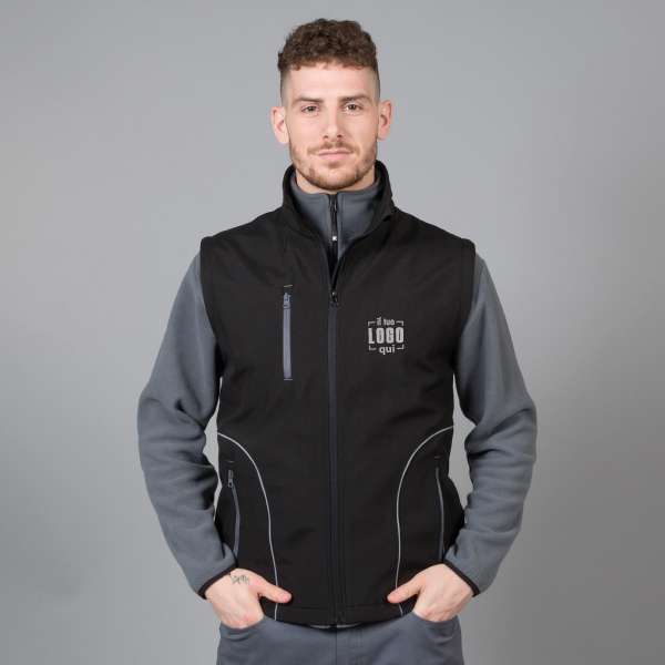 Gilet in soft shell a due strati con trattamento idrorepellente- 100% poliestere stretch- Traspirabilità 14000 g/M2/24h- Interno in pile antipilling- Dettagli rifrangenti- Cerniere antiacqua- Una tasca sul petto con zip- Due tasche esterne con zip- Tessuto interno a protezione del mento- Tessuto appendiabito nel collo- Coulisse al fondo