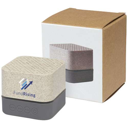 Speaker Bluetooth® 5.0 in paglia di grano, realizzato in paglia di grano per il 51% e in PP per il 49%. Dotato di una batteria ricaricabile agli ioni di litio da 350 mAh integrata, che offre fino a 1,5 ore di riproduzione al massimo del volume. L'uscita altoparlante da 3 watt e i pulsanti integrati di controllo per la musica e il microfono rendono lo speaker Bluetooth® Aira il perfetto altoparlante da scrivania. Confezionato in una scatola regalo e fornito con manuale di istruzioni (entrambi realizzati in materiale ecosostenibile). Fornito con cavo di ricarica Micro-USB.