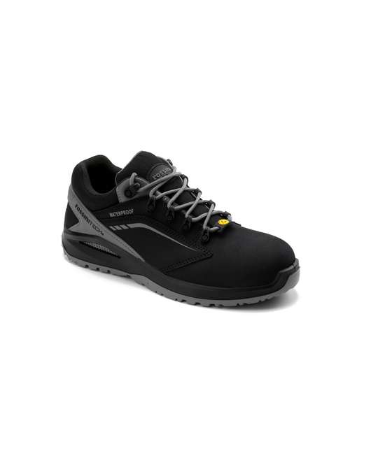 Calzatura bassa in pelle di colore nero con membrana interna traspirante ed impermeabile, con applicazioni di colore grigio. Fodera interna R-DRY antiodore di colore nero, linguetta imbottita, puntale in fibra di vetro, lamina non metallica, soletta anatomica, traforata, con gel antishock sul tallone che assorbe gli urti, estraibile, traspirante ed antistatica. Sistema R-FRESH che favorisce il ricircolo daria e mantiene il piede asciutto. Suola antiscivolo in poliuretano bidensità. CALZATURA METAL FREE WATERPROOF Calzata 11 Mondo Point