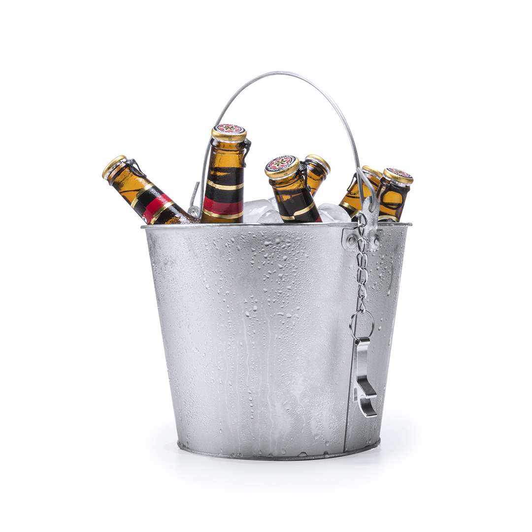 Secchiello in metallo da 6 L con manico e apribottiglie in alluminio con catena inclusa.
