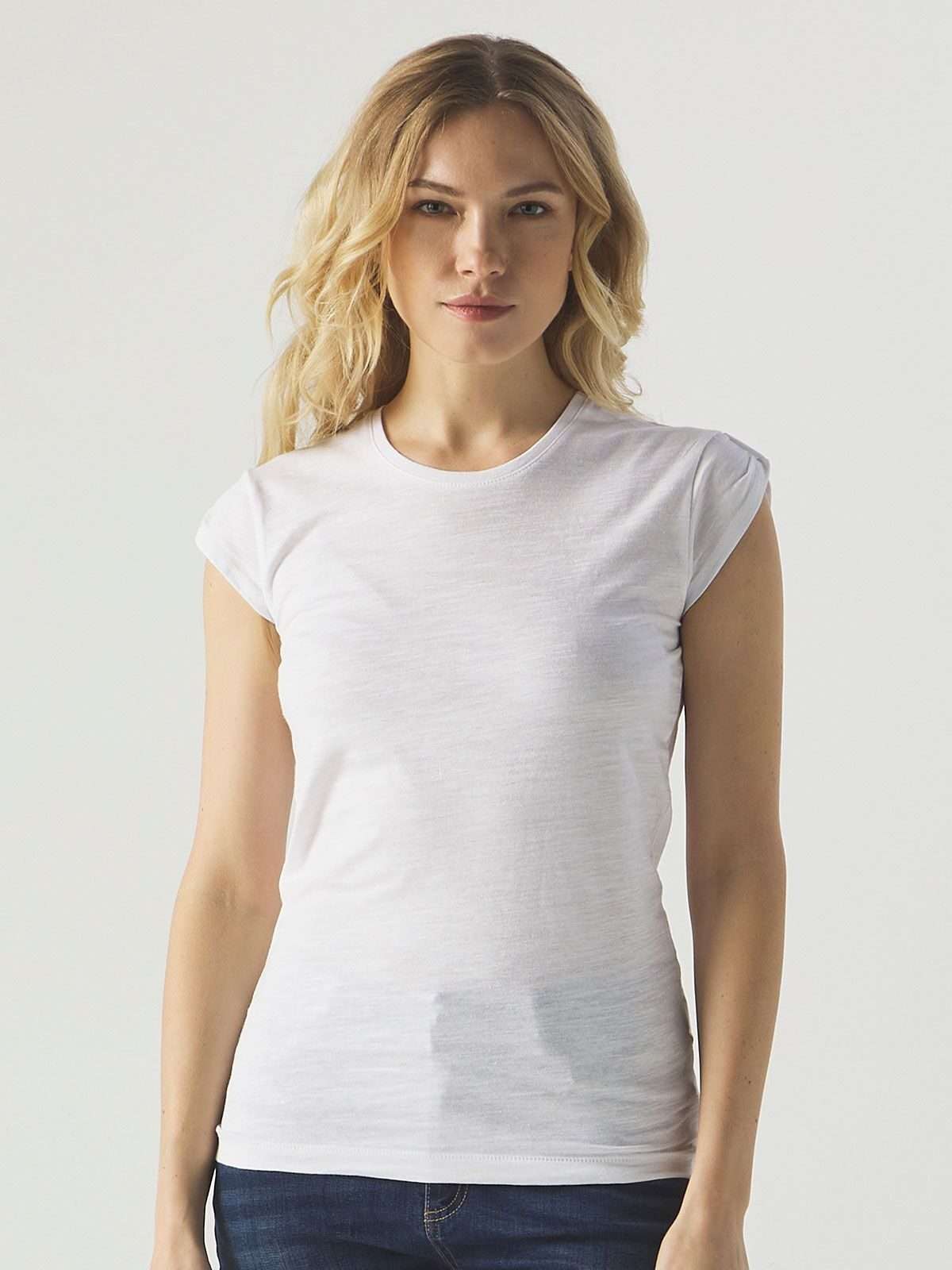 100% cotone . T-shirt taglio femminile con manica corta raccolta sulla spalla, girocollo basso, tessuto slub ring-spun single jersey. Etichetta strappabile.