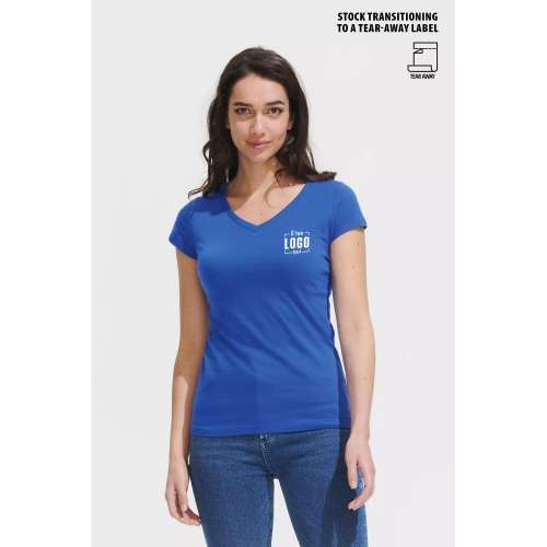 T-shirt femminile con scollo a V profondo, taglio sfiancato e maniche corte. Con bordo in costina ed elastan, nastro di rinforzo e cuciture sagomate. Perfetta per la moda casual e chic.