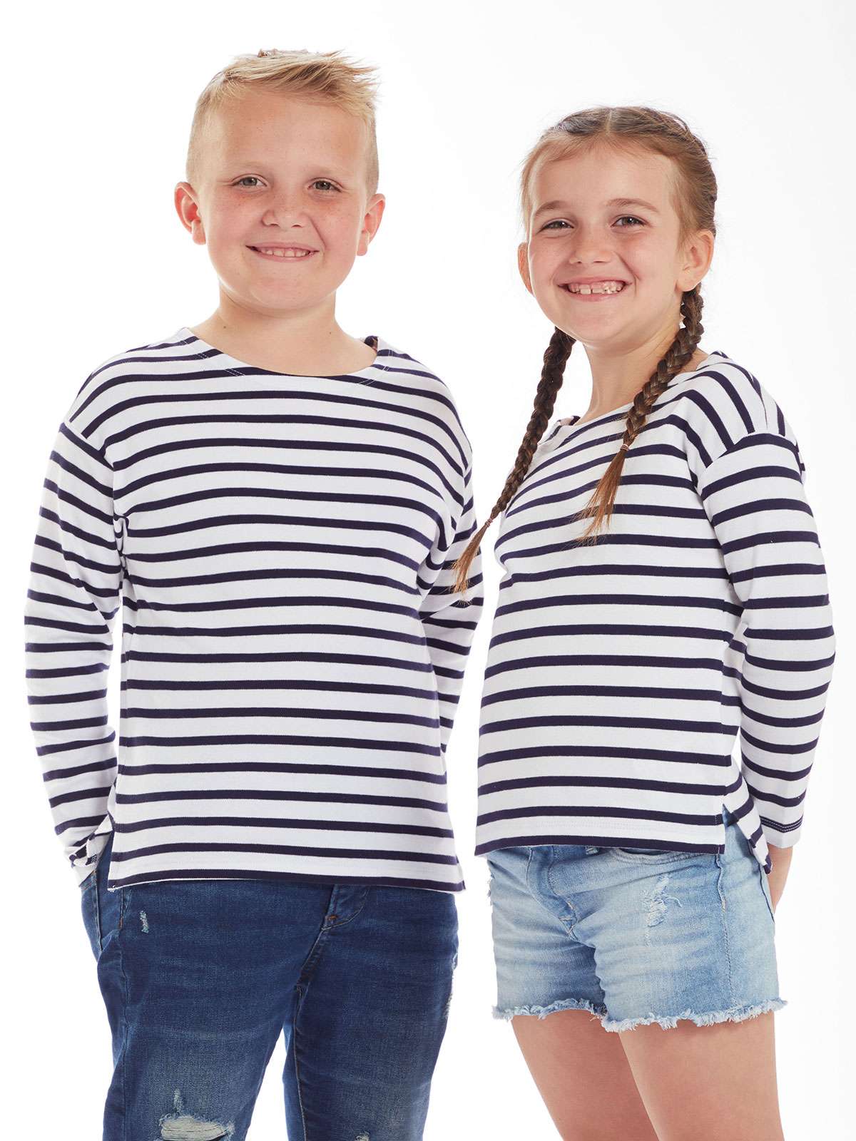 100% Cotone organico interlock. Maglia bambini maniche lunghe, spacchi laterali, più lunga sul retro, stampa a righe tinta in filo, etichetta strappabile.