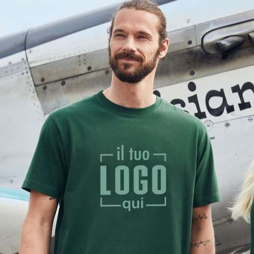 95% cotone 5% elastan. T-shirt in cotone organico ring-spun, collo rotondo con elastan, nastro di rinforzo al collo, lavabile a 40° C, ideale per asciugatura in asciugatrice. Protezione UV 50+