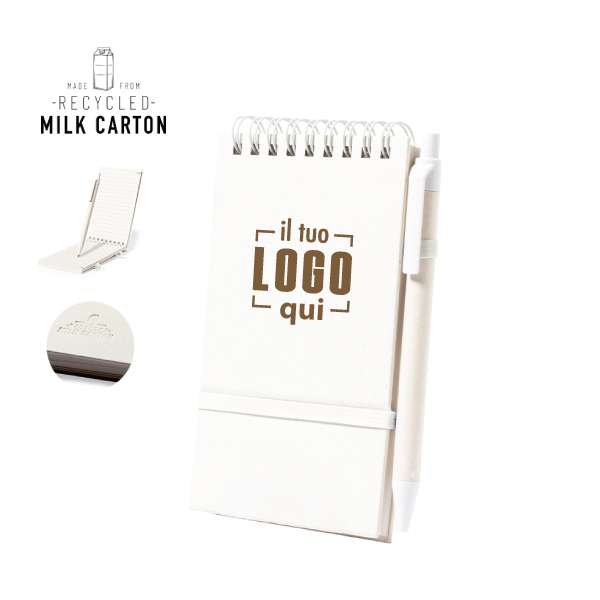 🔖 Logo Cartone del Latte Riciclato sui angoli delle pagine, sulla copertina posteriore e sulla penna