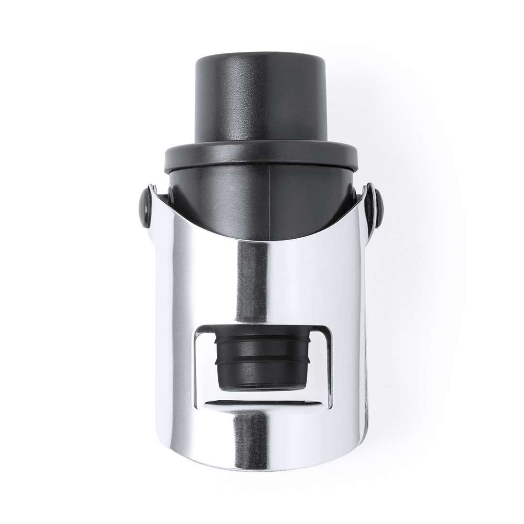 Tappo per sottovuoto, fabbricato in una robusta combinazione di metallo e ABS. Con tappo in silicone e indicatore della data di apertura della bottiglia. Confezionato in una scatola individuale in PVC.