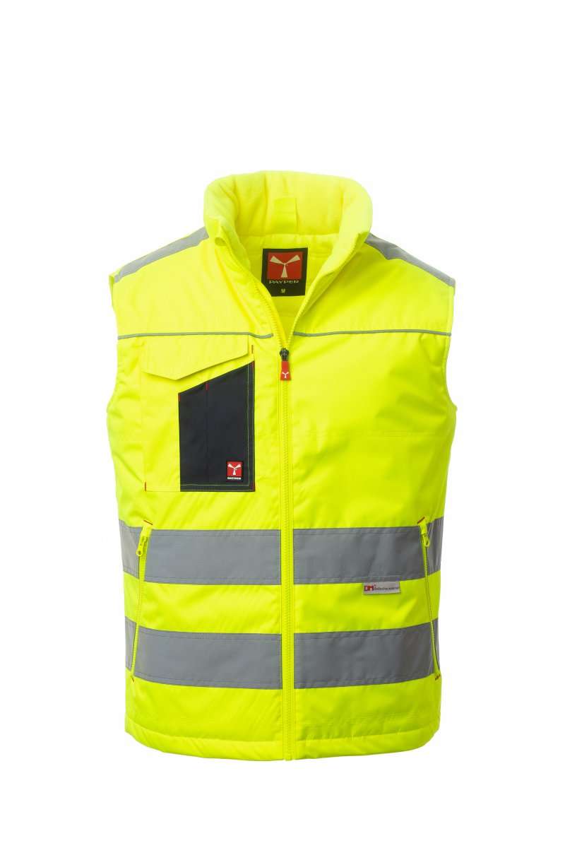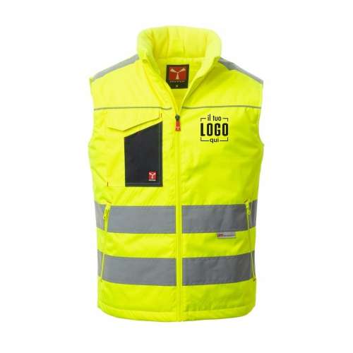 Gilet imbottito unisex in alta visibilità, con bande retroriflettenti su spalle e corpo. Chiusura con cursore in metallo “semi-auto lock” e tiretto personalizzato. Una tasca multifunzione bicolore al petto con anella porta badge e patta con chiusura LOCK SYSTEM. Due tasche esterne con zip. Colletto interno in pile. Una tasca interna con velcro.