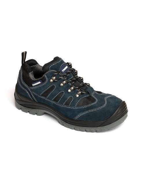 Calzatura bassa in pelle scamosciata di colore blu con inserti in nylon e cuciture di colore a contrasto, fodera interna di colore grigio e nero, linguetta imbottita, puntale in composito, lamina non metallica, soletta anatomica, traforata, con tallone antishock, estraibile traspirante e antistatica. Suola in poliuretano bidensità.