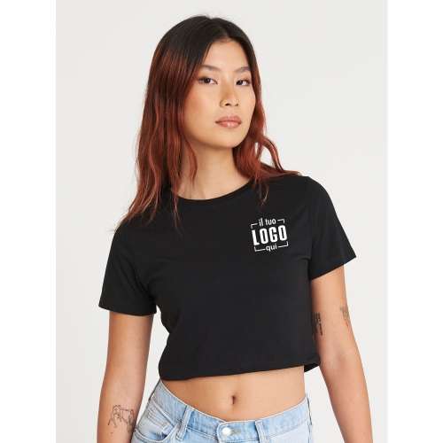 50% poliestere, 25% viscosa, 25% cotone. T-shirt sagomata, maniche corte, superficie adatta a stampa e ricamo, girocollo a costine, cucitura doppio ago sulla manica e sull'orlo inferiore. Etichetta strappabile. Col. HBK: 40% Vis. 40% Cot. 20% Pol.