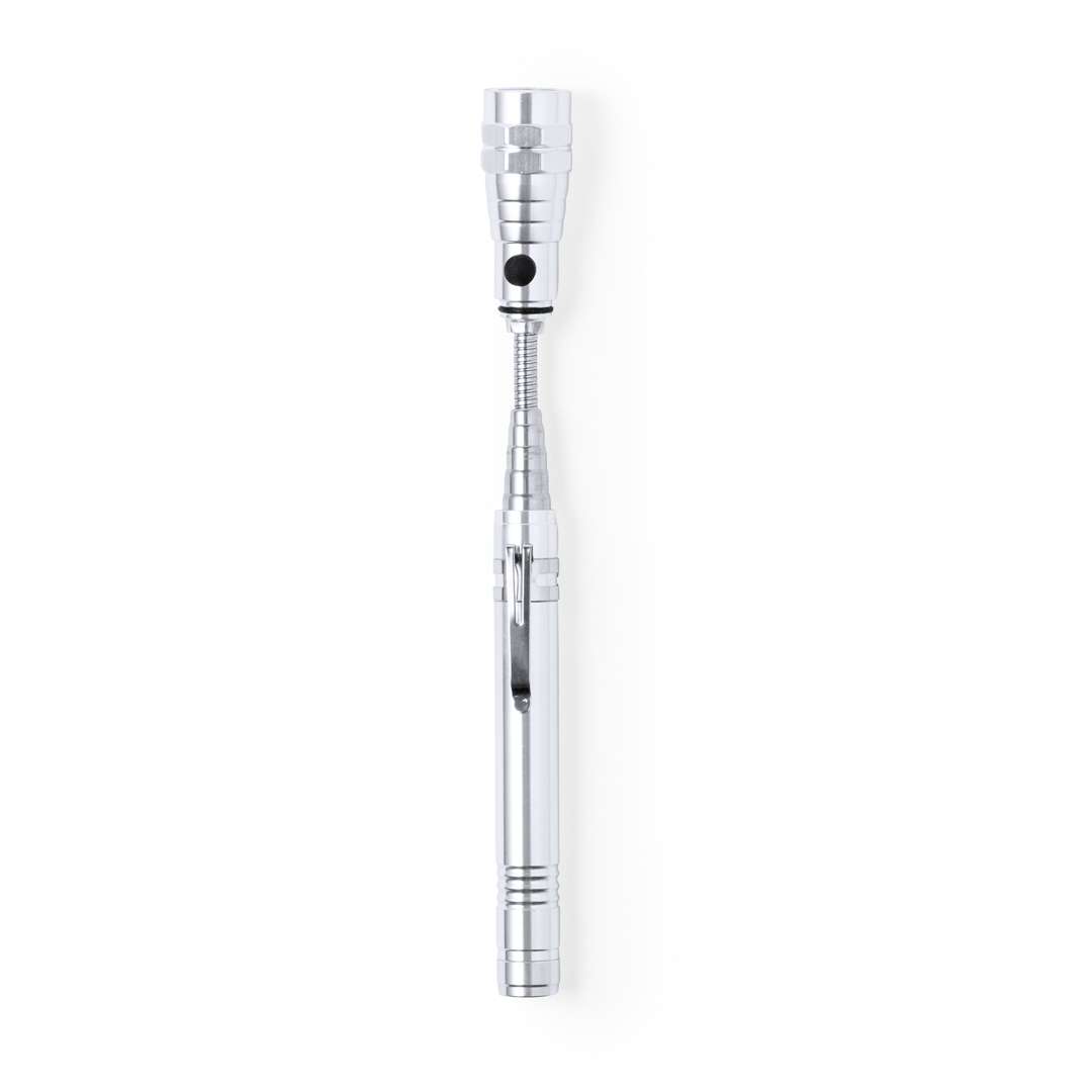 Pratica e versatile lanterna in alluminio con testa estensibile (triplicando la lunghezza) e flessibile per arrivare ovunque, è anche dotata di magneti che si adattano alle varie esigenze. Dispone di 3 potenti LED per un'illuminazione efficiente. È alimentata da batterie a bottone incluse e dispone di una clip metallica per un facile aggancio. Confezionato singolarmente in una scatola kraft di design.