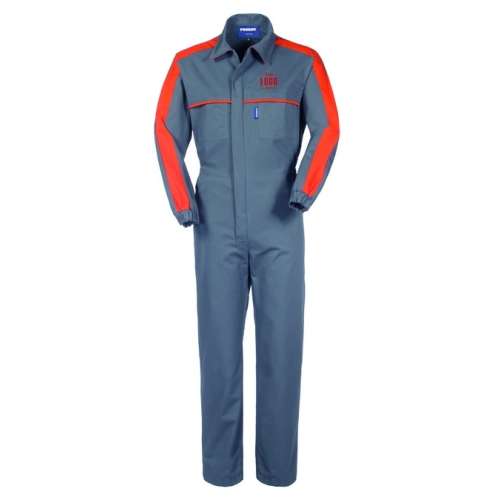 Tuta da lavoro con chiusura con cerniera centrale coperta, inserti su spalle e maniche e profilo al petto di colore arancio, collo a camicia con sottocollo di colore arancio. Due tasche anteriori interne chiuse con punto velcro, due taschini al petto applicati chiusi con cerniera coperta da aletta, elastico in vita posteriore, elastico ai polsi.