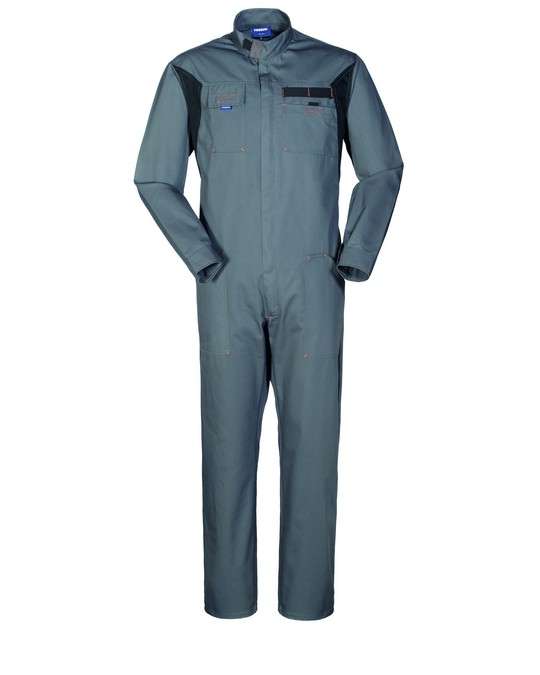 Tuta da lavoro con collo alla coreana chiuso con velcro, chiusura anteriore con cerniera coperta. Una tasca applicata al petto sinistro chiusa con velcro, un portacellulare applicato al petto destro chiuso con aletta e velcro, due tasche inferiori applicate, un porta metro. Elastico in vita posteriore, polsi chiusi con velcro, inserti e travette di colore a contrasto.