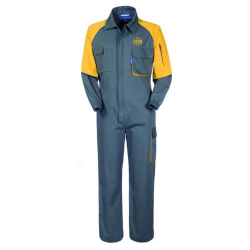 Tuta da lavoro con chiusura con cerniera centrale coperta, profilo blu rifrangente inserito nella cucitura delle maniche a raglan, collo a camicia. Un tascone applicato su gamba sinistra con soffietto laterale di colore giallo chiuso con aletta e velcro, un taschino applicato al petto sinistro con soffietto laterale di colore giallo chiuso con aletta e velcro, un taschino porta cellulare applicato al petto destro con soffietto laterale di colore giallo chiuso con aletta e velcro, una tasca portapenne applicata al petto destro, un taschino applicato alla manica sinistra chiuso con cerniera, elastico invita posteriore, elastico ai polsi.