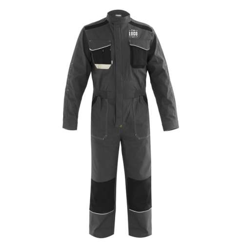 Tuta da lavoro multistagione in canvas stretch con collo alla coreana chiuso con velcro, chiusura centrale con cerniera in plastica coperta. Una tasca applicata al petto destro con inserto rifrangente, con portapenne e chiusa con aletta e velcro, una tasca applicata al petto sinistro con patella removibile per facilitare il ricamo chiusa con aletta e velcro, cuciture di rinforzo ai gomiti, polsi regolabili con velcro, elastico in vita, due tasche inferiori applicate, una tasca portametro applicata su gamba destra, una tasca posteriore a destra chiusa con aletta di colore a contrasto e velcro. Rinforzi di tessuto a contrasto sulle ginocchia e travette a contrasto, profilo rifrangente inserito nelle alette delle tasche e sotto le ginocchia.