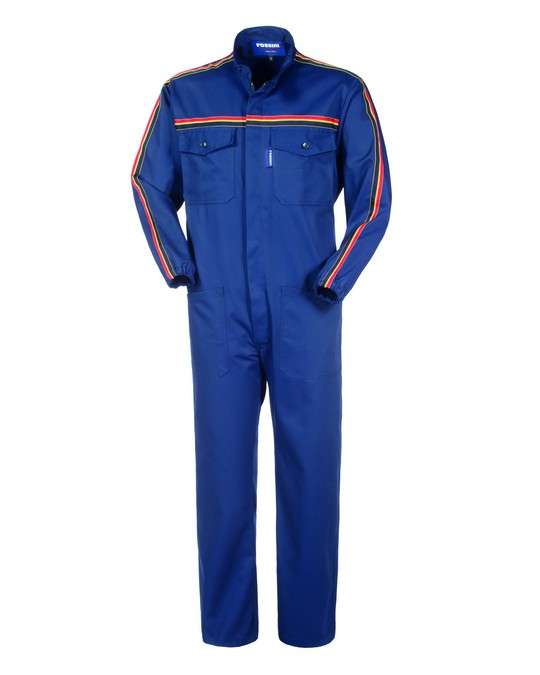 Tuta da lavoro con chiusura con cerniera centrale coperta, striscia tricolore su spalle, maniche e petto, collo alla coreana chiuso con un bottone. Due tasche anteriori applicate, due taschini applicati al petto chiusi con aletta e bottone, elastico in vita posteriore, elastico ai polsi.