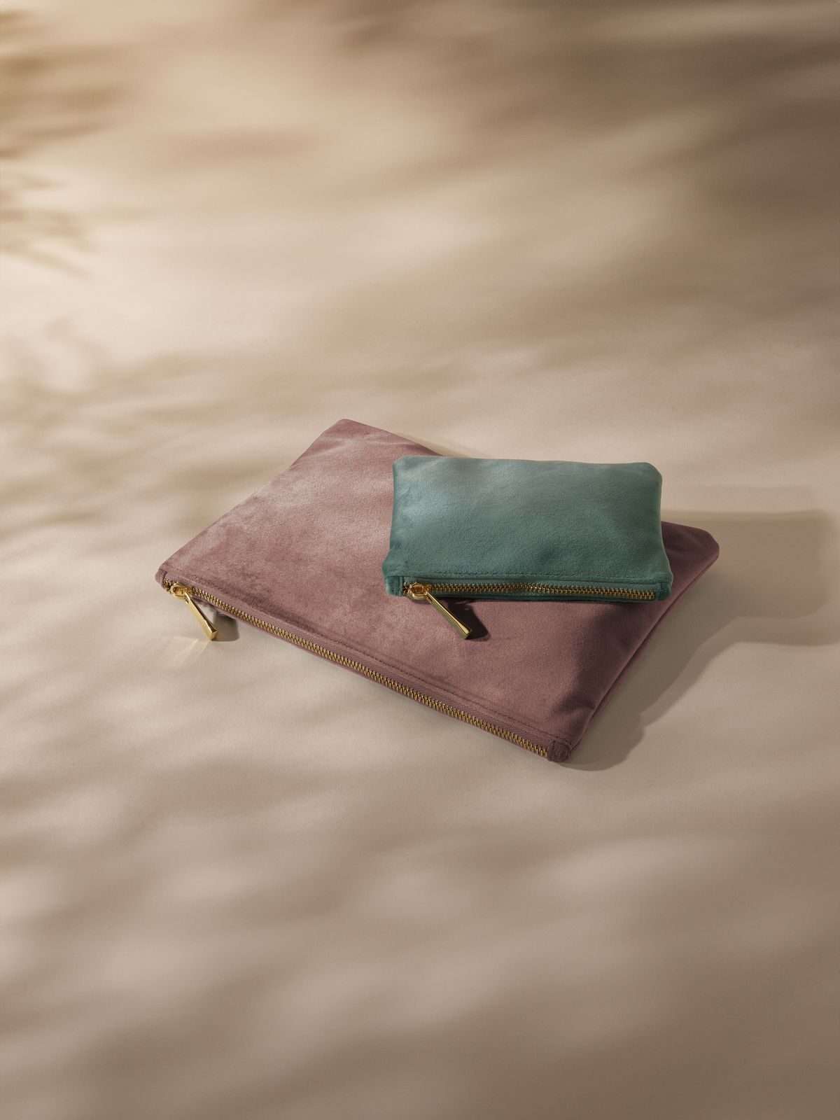 100% poliestere riciclato. Astuccio in poliestere riciclato certificato GRS, multiuso, fodera con zip nascosta per la decorazione, cerniera in metallo in oro lucido, progettato per la decorazione. Etichetta strappabile. Dimensioni: S: 17x12cm, L: 30x20cm.