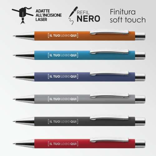 Penna a sfera elegante e professionale con fusto in metallo rivestito in materiale soft touch, per una presa comoda e un look raffinato. Il meccanismo a scatto garantisce praticità, mentre le minuterie in metallo cromato aggiungono un tocco distintivo. Refill nero incluso, ideale per uso aziendale o come gadget personalizzato.
