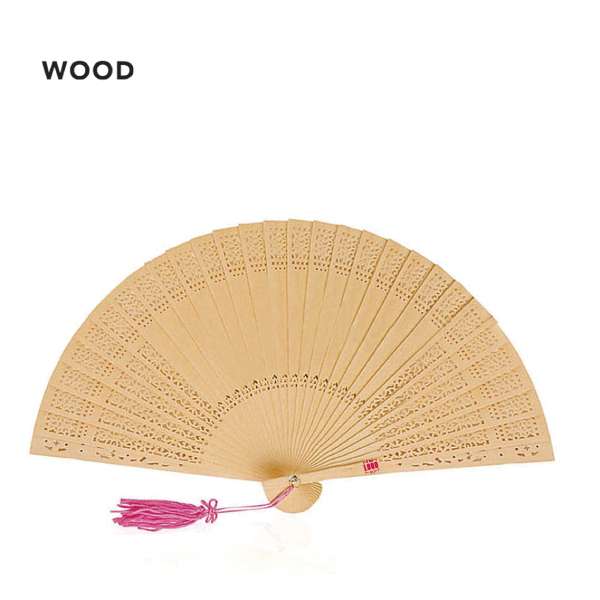 Ventaglio dal design sofisticato, realizzato con stecche in legno naturale fustellate, dotato di una graziosa cinghia di trasporto con pompon. Un accessorio raffinato, perfetto per eventi eleganti, cerimonie, matrimoni o come omaggio promozionale di classe. Presentato singolarmente in una scatola regalo.