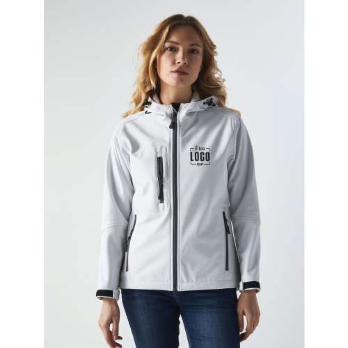 94% poliestere, 6% elastan. Giacca da donna in softshell a 3 strati, cappuccio con fermi in plastica, occhielli e cordino neri.Due tasche laterali con zip, una taschino sul petto con zip, tirazip in plastica, zip interna lato cuore per la personalizzazione, polsini regolabili con velcro, interno in micropile. Bordo inferiore con cordino regolabile con fermi.Impermeabilità 8000 mm, traspirabilità 1000 gr/m2. Etichetta strappabile.