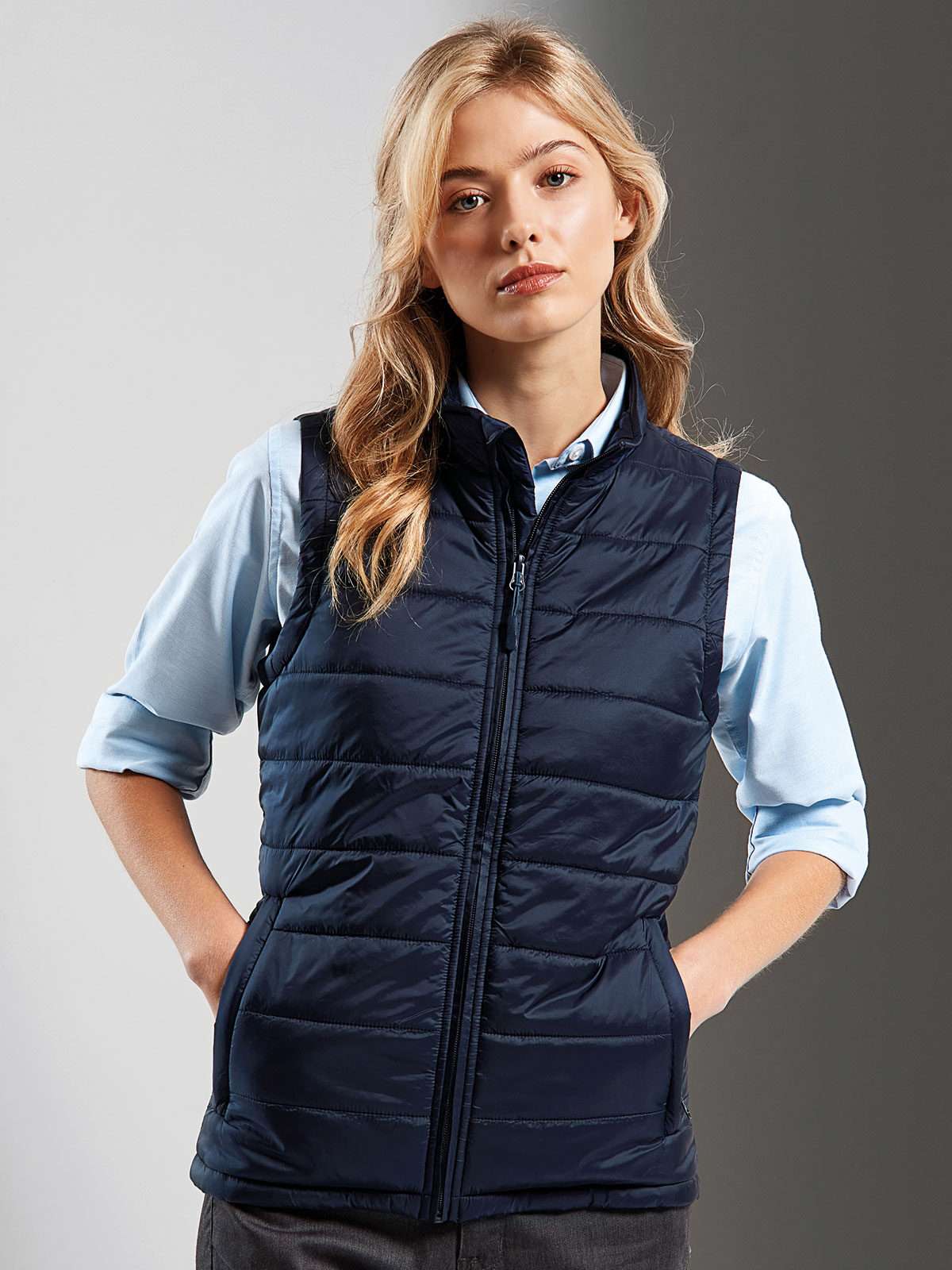 100% nylon riciclato, fodera e imbottitura 100% poliestere riciclato. Gilet da donna, imbottito leggero e impmeabile, con cuciture orizzontali, tasche laterali con zip, tasca interna, puo' essere ricamato, ripiegabile nella sua sacca.