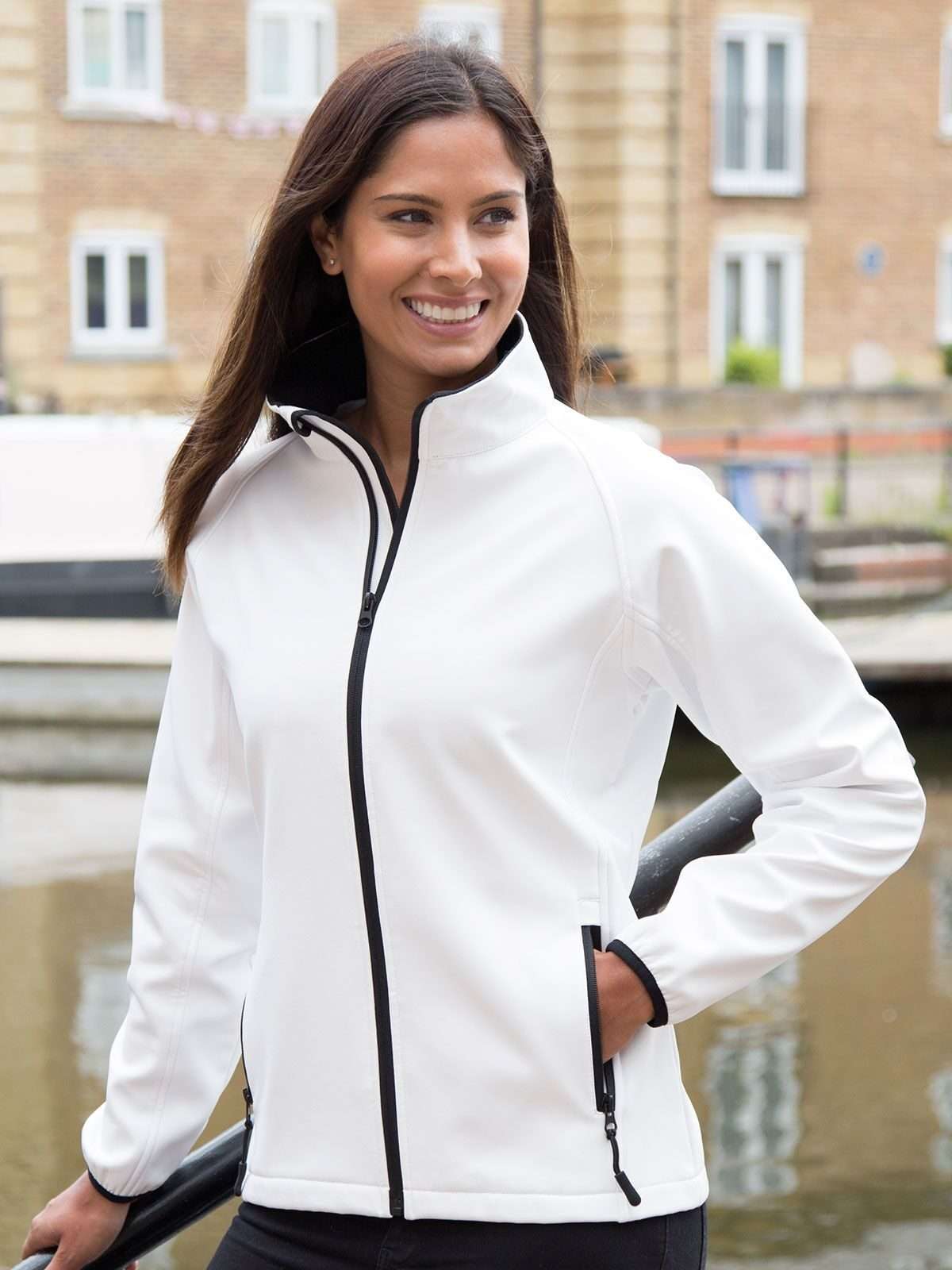 100% poliestere. Giacca in softshell a due strati con interno in micropile, antivento e traspirante, zip con protezione per il mento YKK, 2 tasche laterali con zip, polsini elasticizzati, leggermente sfiancata.