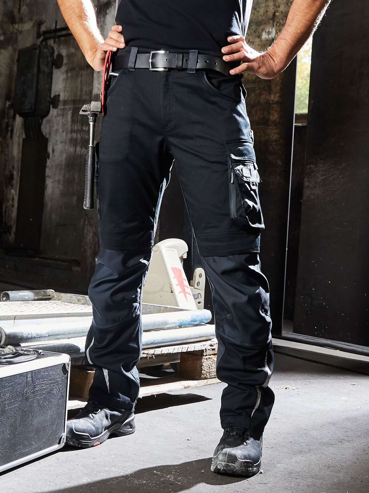 65% poliestere riciclato, 32% cotone organico, 3% elastan. Inserti: 100% poliammide. Pantaloni da lavoro, taglio stretto, resistenti, tessuto elasticizzato, girovita elastico con passanti per cintura, tasche imbottite sulle ginocchia rinforzate con CORDURA®, cuciture triple, 2 tasche con zip, diverse tasche multi-uso. Dettagli riflettenti (no DPI). Zip: YKK.