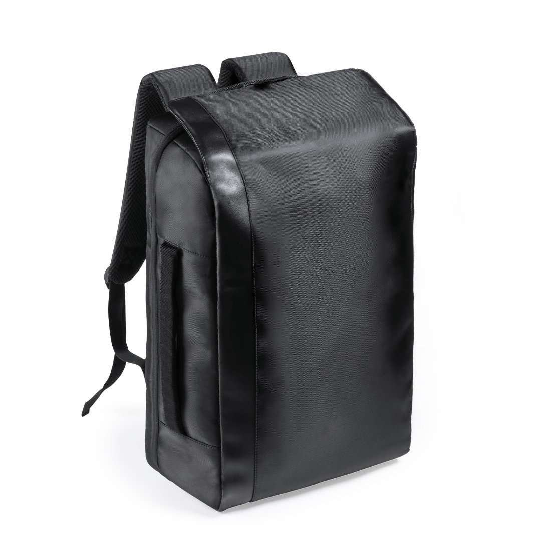 Zaino elegante in poliestere resistente con dettagli in similpelle. Con ampia patta frontale e scomparto principale con chiusura a zip a doppio cursore. Interno con tasche imbottite per tablet fino a 12 e laptop fino a 17. Maniglia laterale imbottita e accessorio per aggancio al trolley, con tasca antifurto sul retro. Schienale e spallacci regolabili e imbottiti.