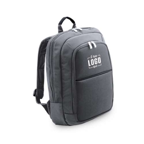 Zaino in nylon resistente 900D, schienale e spallacci imbottiti, con chiusura a cerniera, tasca frontale e manico rinforzato. Apposito scomparto interno imbottito per laptop fino a 15 ".