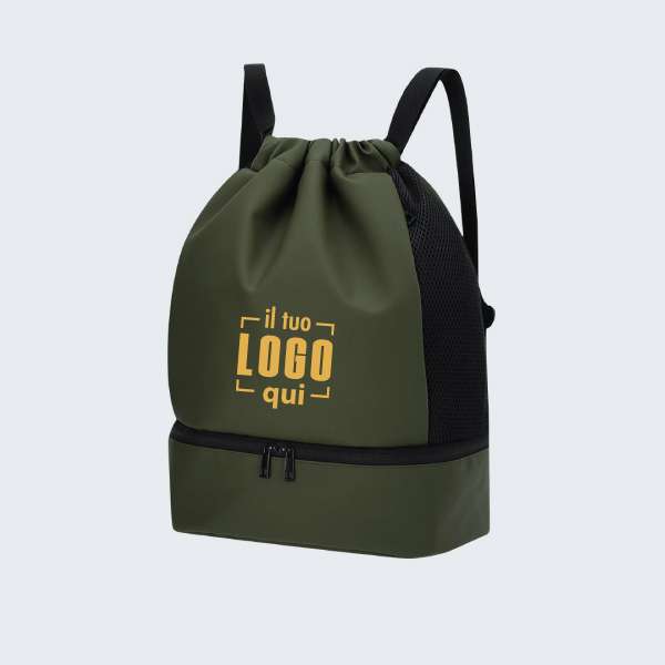 Zaino in morbido PU con compartimento principale con chiusura a corda e piccolo taschino interno con chiusura a zip. Include tasca alla base per scarpe con chiusura a doppia zip e tasche frontali con chiusura a zip di accesso rapido. Con lati traspiranti e spallacci regolabili.