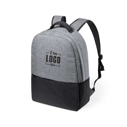 Zaino in poliestere 600D RPET, realizzato in plastica riciclata per favorire il riutilizzo dei rifiuti plastici e contribuire alla sostenibilità del pianeta. In un'elegante finitura bicolore, include un'etichetta esterna con il logo RPET. Tasca principale con scomparti imbottiti per notebook fino a 15 pollici e tablet fino a 10 pollici. Schienale e spallacci imbottiti.