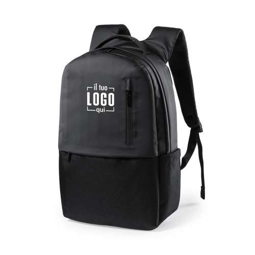 Zaino Antonio Miro di qualità premium in resistente poliestere 600D con un design sobrio in nero. Con chiusura a zip, tasca frontale e manico rinforzato in metallo. Schienale e spallacci ergonomicamente imbottiti, scomparto interno imbottito per laptop fino a 15" e tablet fino a 10". Manicotti interni per penne e smartphone. Con logo Mirò sul davanti.