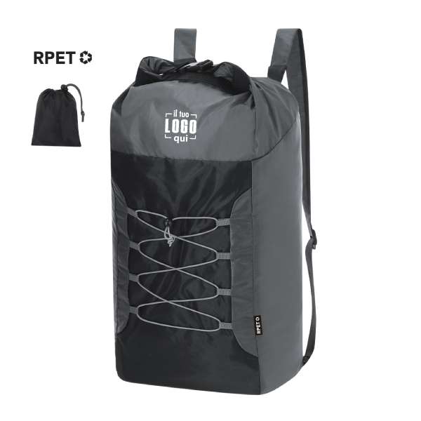 Zaino pieghevole in resistente poliestere RPET 210D e ripstop. Con chiusura a gancetto nel compartimento principale, corde elastiche e cinghie per le spalle regolabili.Il materiale RPET è realizzato con plastica riciclata, per promuovere il riutilizzo dei rifiuti plastici e contribuire alla sostenibilità del pianeta.