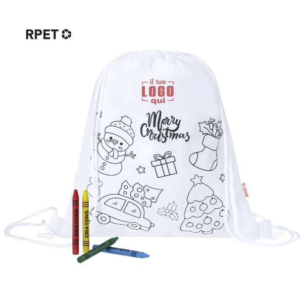 Zainetto natalizio per bambini in RPET da colorare, con 4 pastelli inclusi. Design festivo, corde autochiudenti e materiale riciclato, perfetto come regalo creativo e sostenibile per Natale.