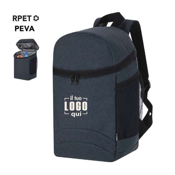 Zaino frigorifero di grande capacità realizzato in resistente poliestere RPET 600D di alta qualità. Scomparto principale con chiusura lampo a doppio cursore, con interno in PEVA. Con tasche laterali in rete. Cinghie delle spalle regolabili e imbottite. Include una fascia nella parte superiore. Completamente imbottito. Distintivo RPET sull'etichetta. Il materiale RPET è realizzato a partire da plastica riciclata, per promuovere il riutilizzo dei rifiuti plastici e contribuire alla sostenibilità del pianeta.