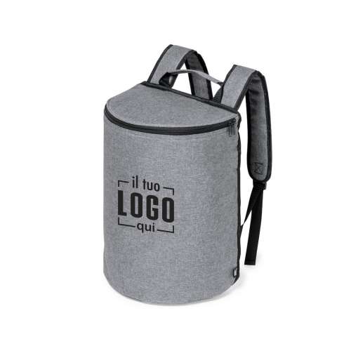 Zaino termico realizzato in resistente 600D RPET. Finitura grigia, con maniglia per il trasporto. Spallacci imbottiti e regolabili. Scomparto principale con chiusura a zip e manici in metallo. Etichetta interna ed esterna isotermica in alluminio con logo RPET.